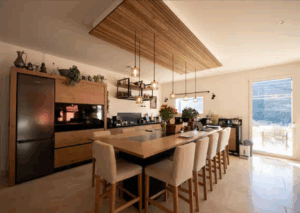 La maison est équipée d’une VMC double flux compacte Nilan, qui assure chauffage d’appoint, eau chaude sanitaire et ventilation. Des panneaux photovoltaïques de 6 kWc complètent le dispositif, permettant de produire plus d’électricité que la consommation annuelle du foyer. Par ailleurs, un système de récupération des eaux grises alimente les toilettes, réduisant encore l’impact environnemental.